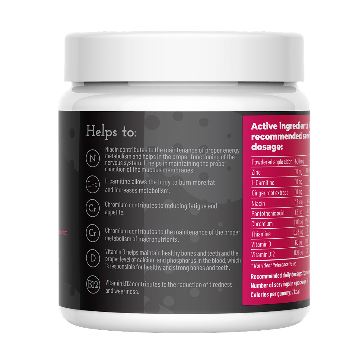 It contains apple cider vinegar (500 mg), L-carnitine (10 mg), chromium (1100 mcg), reproductive roots (10 mg), and vitamin D (60 mcg).